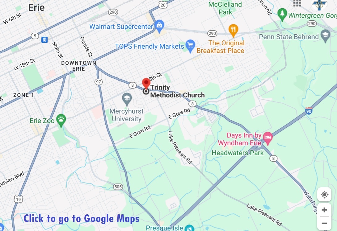 New Here? What to Expect Learn what to expect before coming to Trinity Methodist Church. Click here to learn more. Our Location 3952 Pine Avenue, Erie, Pa. 16504 Our Team Click here to meet our team!